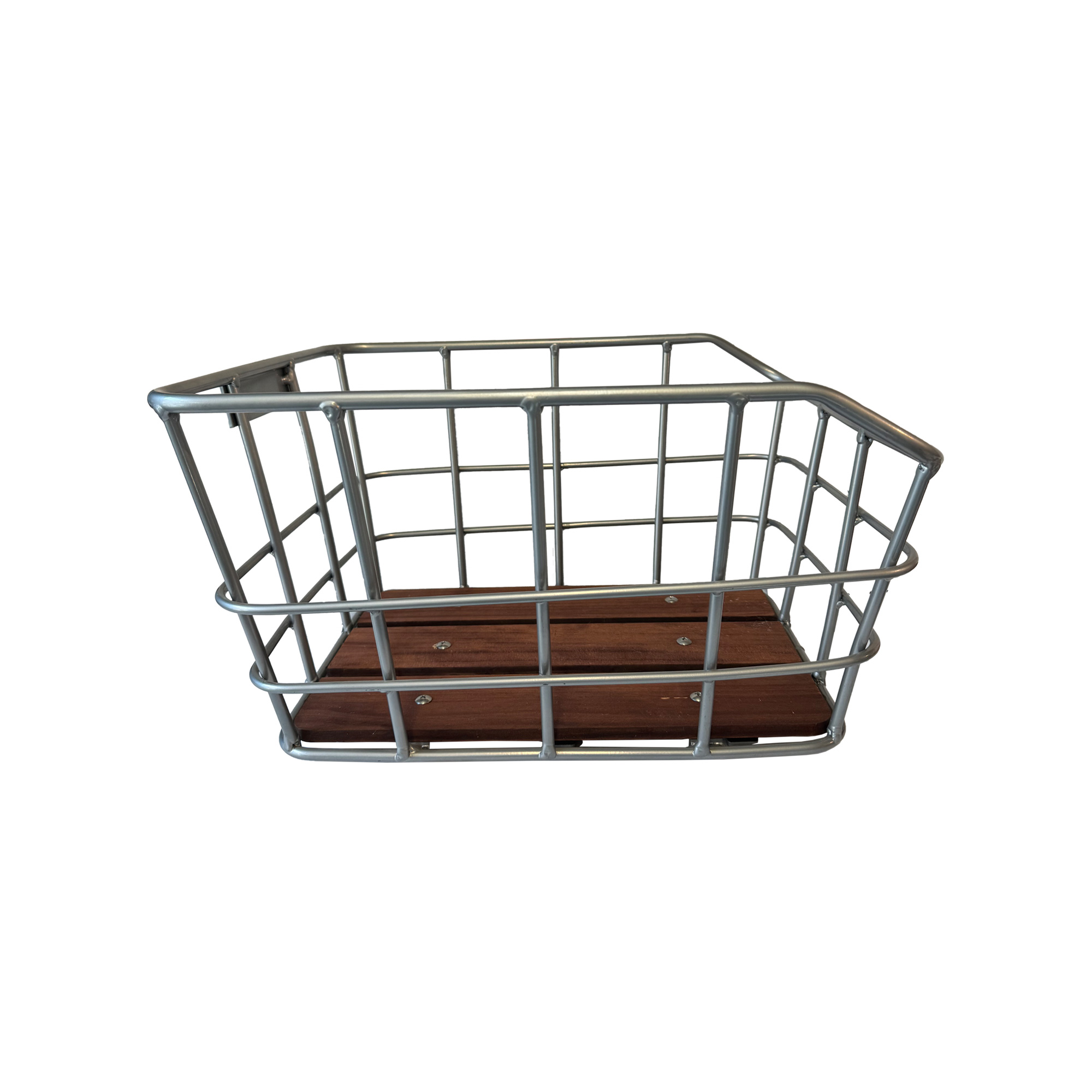 En let og robust aluminiumsbagkurv med elegant sølvfinish og bund i mørkt trælook.